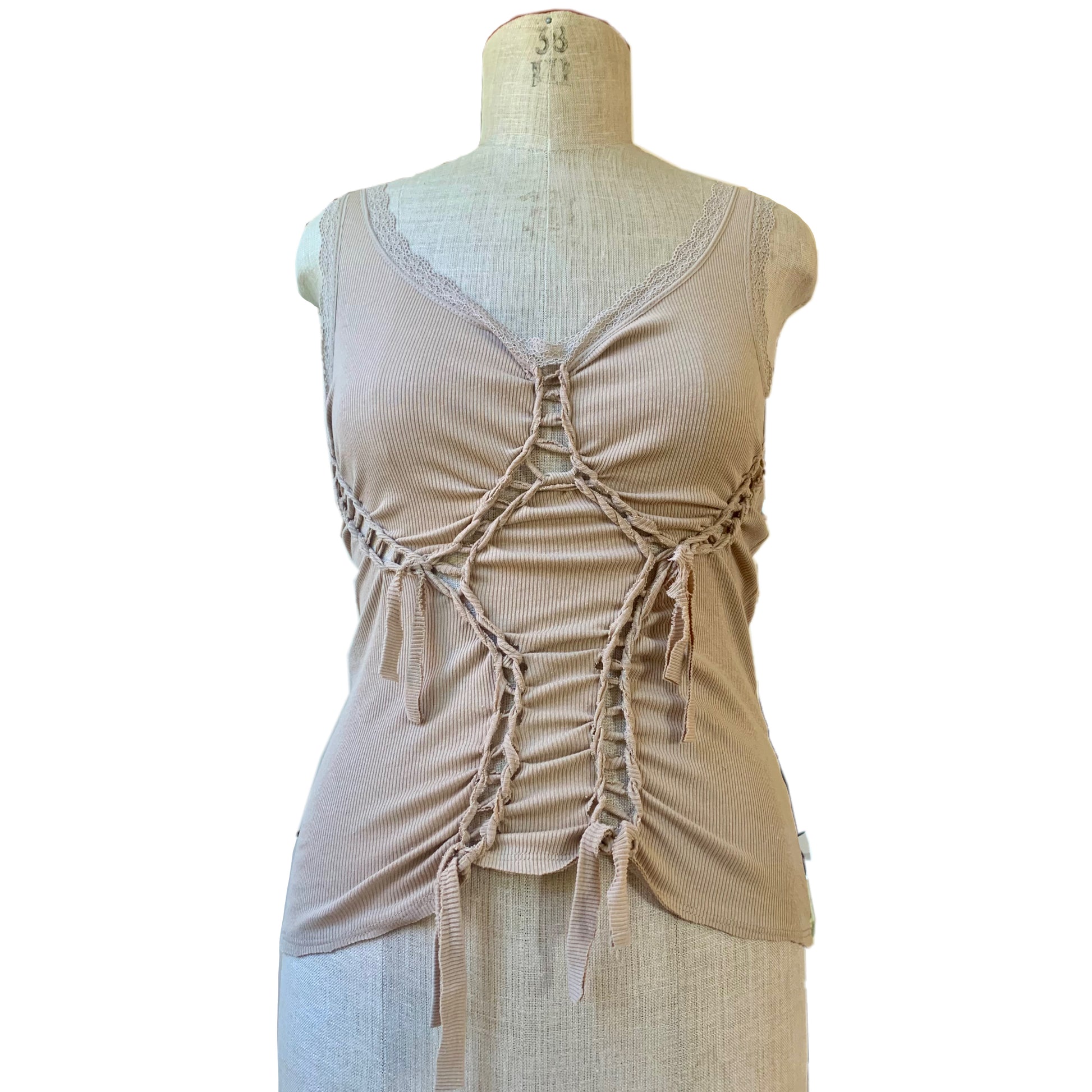 This top is handmade with cut outs. It has cute lace details and fits XS/S/M, flexible. There is only one available like this