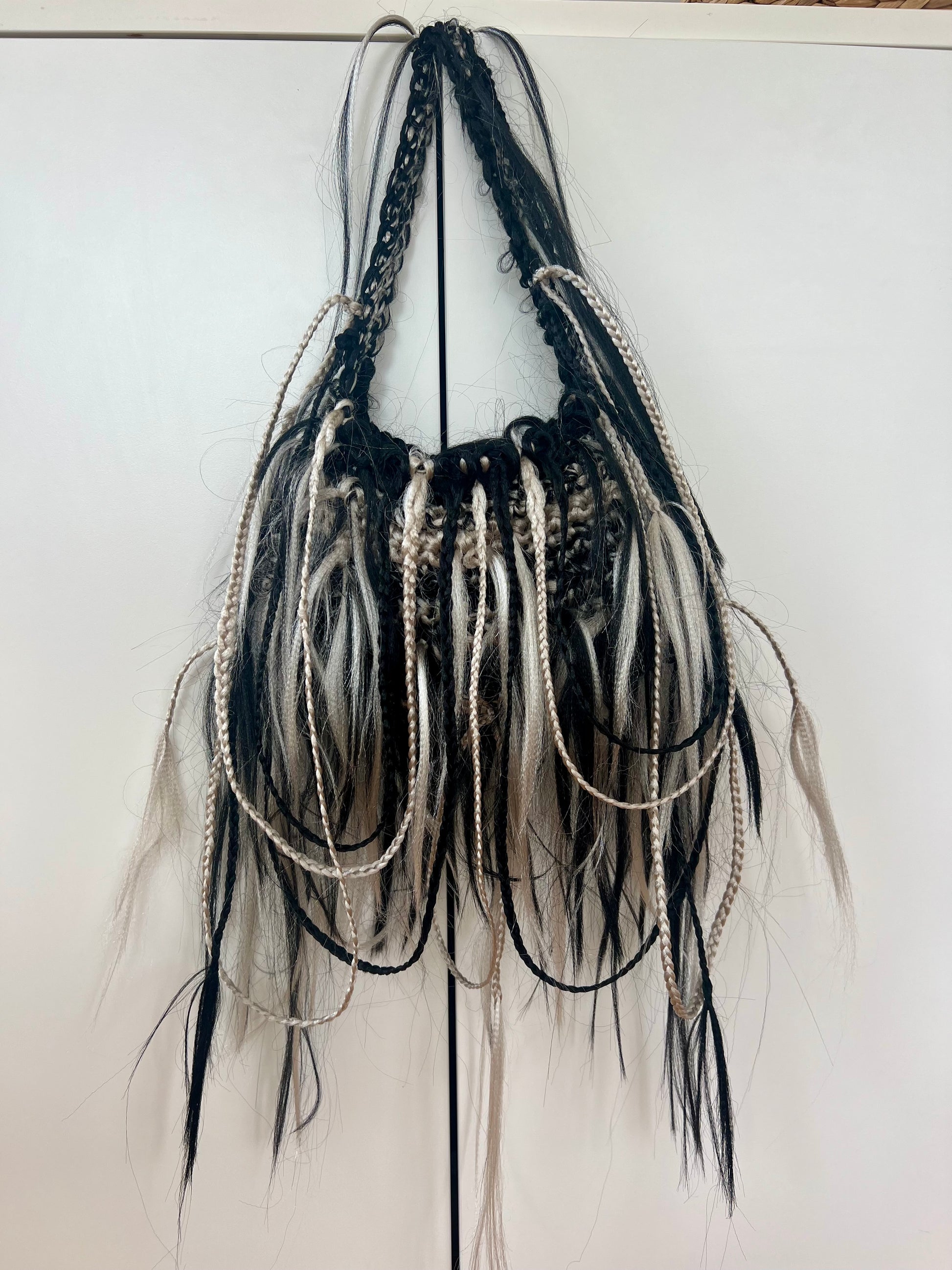 This bag is hand crochet with black and platinum blonde fake hair, decorated with braids.