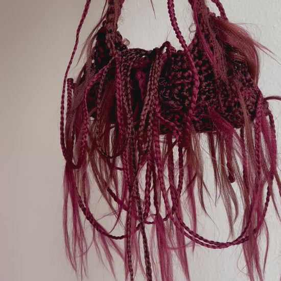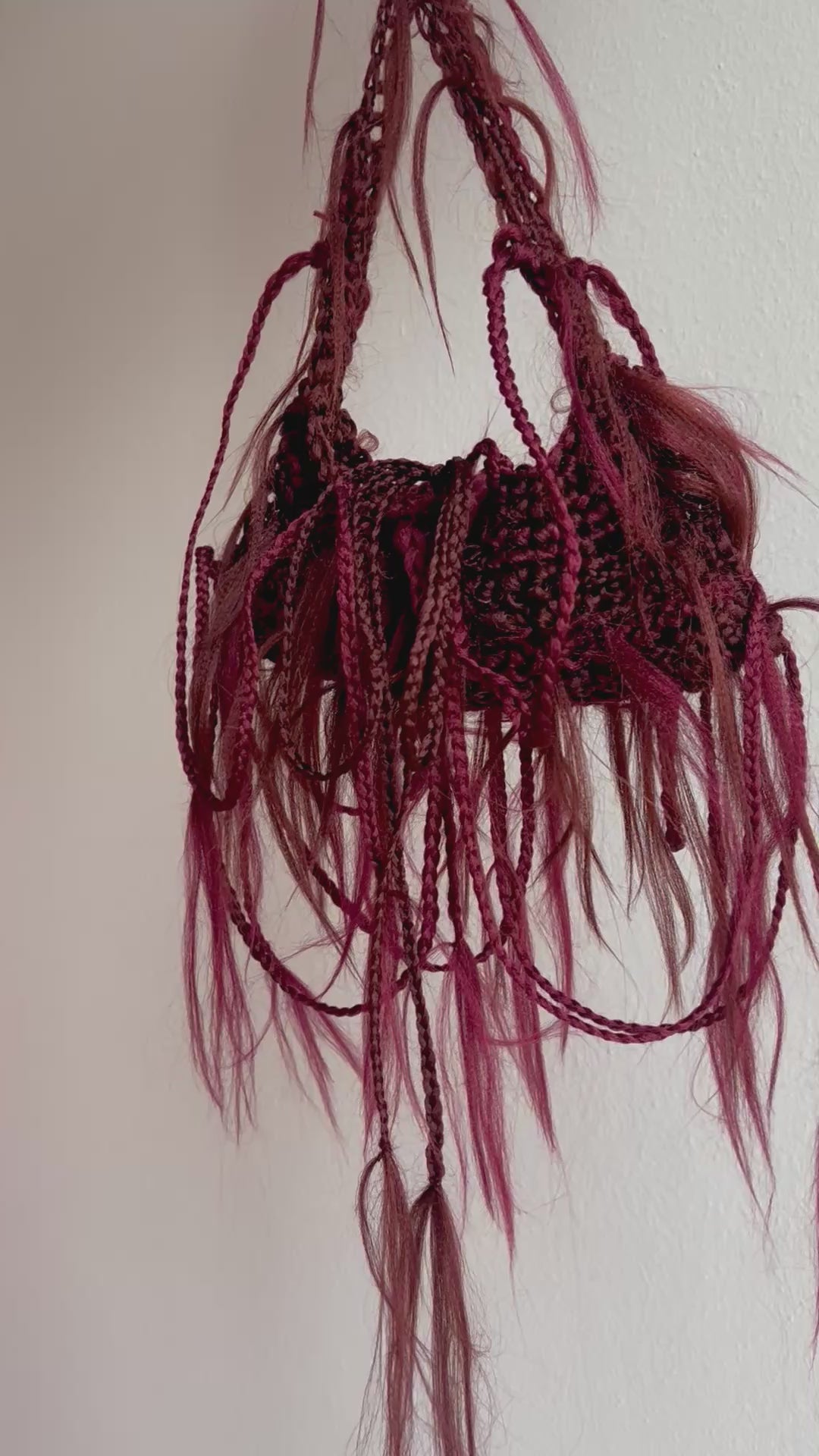 This bag is hand crochet with synthetic hair reinterpreted as textile, made of all dark red, light red shades. I made a series of mini hairbags ready to ship! that are perfect to hold your phone, lipgloss and cigarettes, or any other important items. the bag can be closed by tiying a bow with two braids. It has crochet inner lining to protect the bag and your belongings