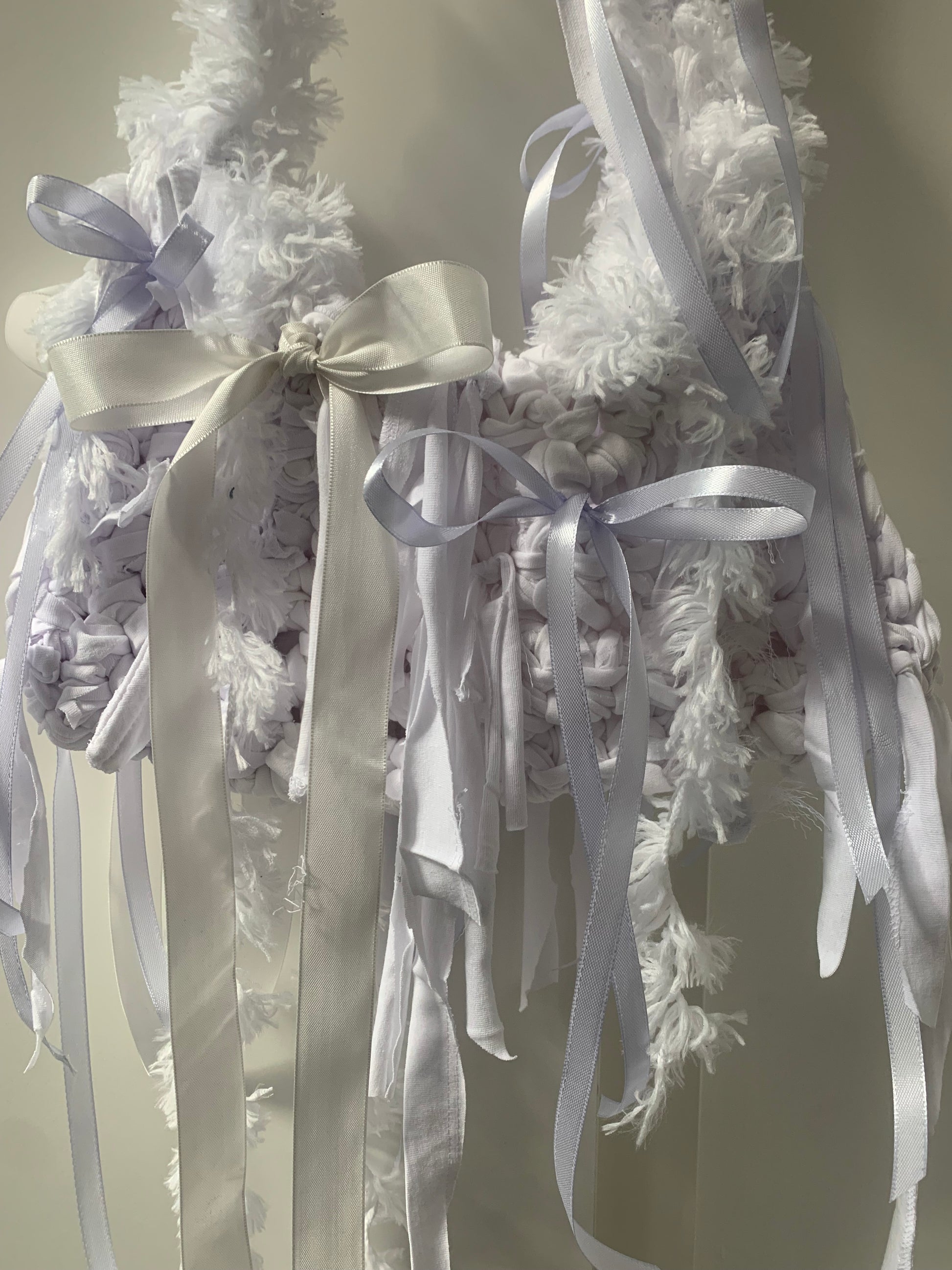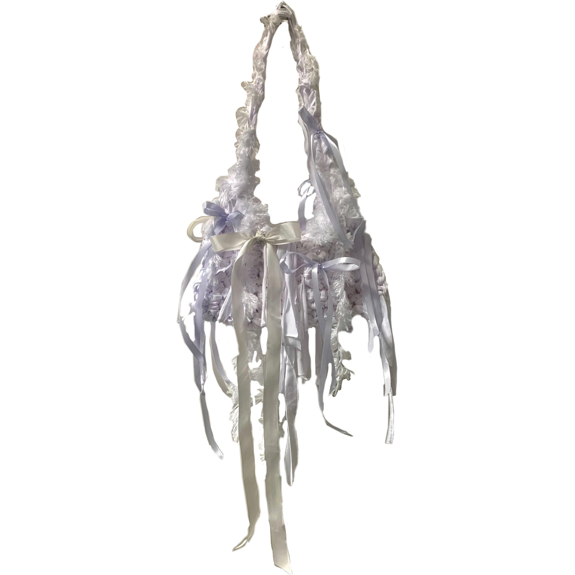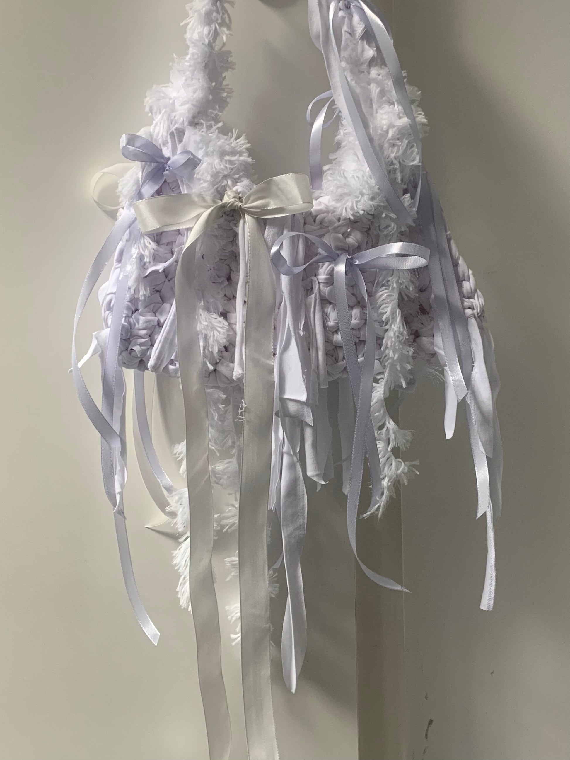 This bag is made from recycled white fabric, decorated with shiny white and violet bows, and fluffy wool. This is a one by one piece so there is only one bag like this available. It’s a shoulder bag that fits all necessary items.